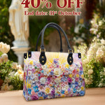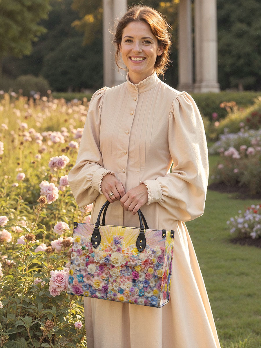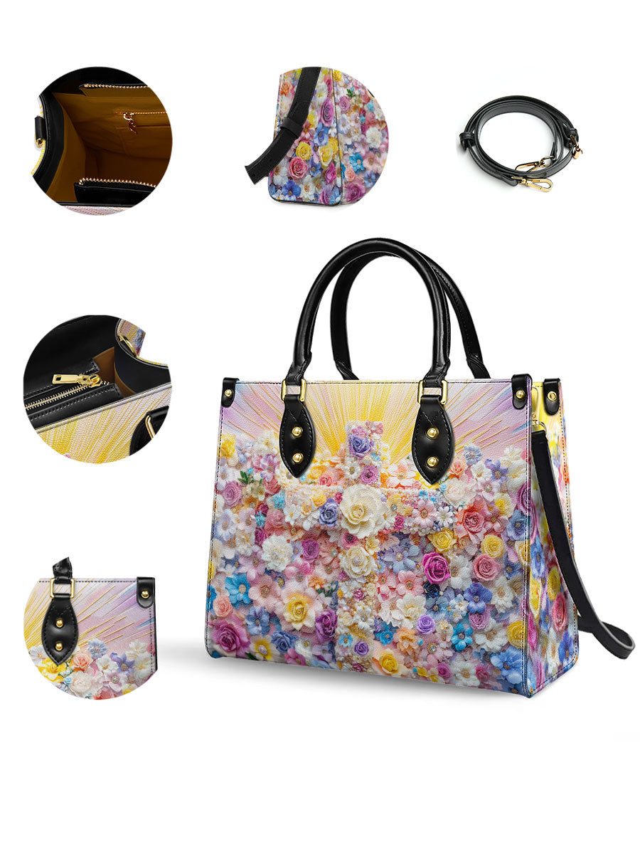 This vibrant leather bag features a stunning cross made entirely of colorful blooming flowers, symbolizing the beauty of resurrection, renewal, and divine love. Radiant golden light emanates from behind the cross, highlighting its sacred significance and creating a sense of hope and spiritual upliftment. The pastel hues of pink, blue, yellow, and white flowers reflect joy, grace, and faith, making this design a celebration of life and faith.