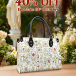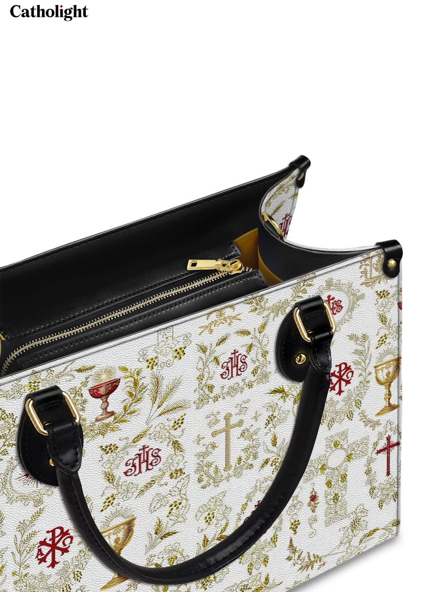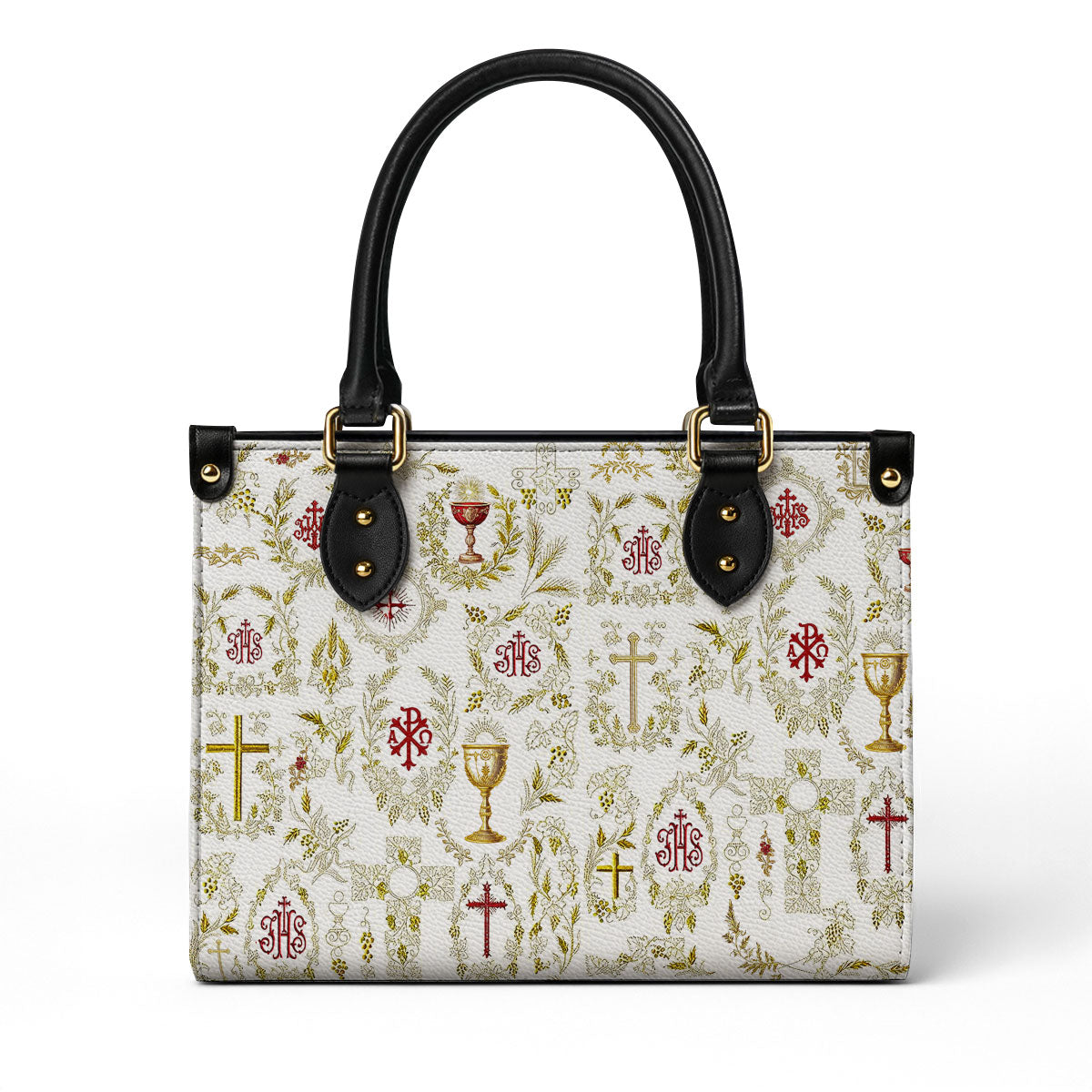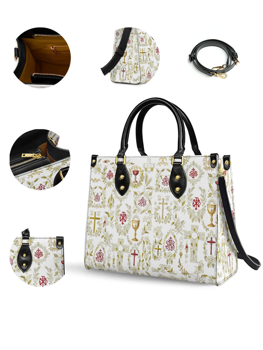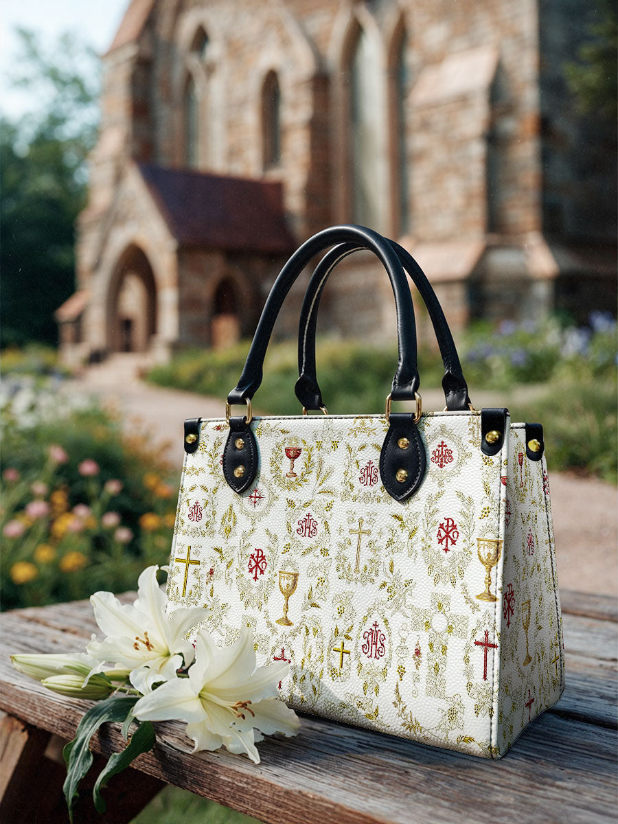 This elegant leather bag features a refined and intricate pattern of sacred Christian symbols, including the cross, chalice, Eucharistic host, and holy monograms. Each emblem is beautifully adorned with golden accents and surrounded by delicate floral and vine motifs, symbolizing the richness and depth of the Catholic faith. The harmonious combination of white, gold, and deep red creates a timeless and reverent design, celebrating the sacred mysteries and the beauty of devotion.