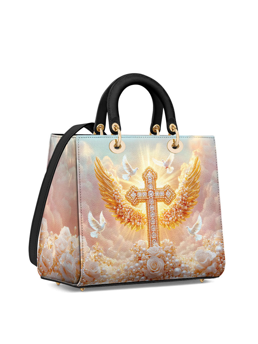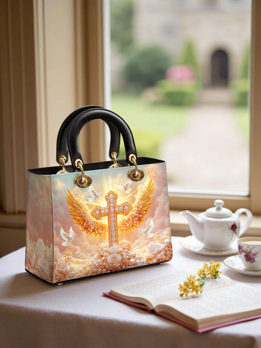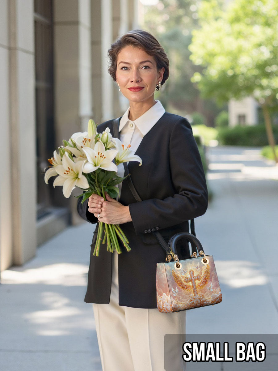 This Lady Leather Bag features a heavenly composition centered on a radiant golden cross adorned with jewels, rising from a bed of white roses and luminous clouds. Framed by golden wings and surrounded by gentle doves in flight, the artwork evokes themes of resurrection, peace, and divine glory. Soft pastel tones of peach, ivory, and light blue add a dreamlike quality that reflects faith and serenity.