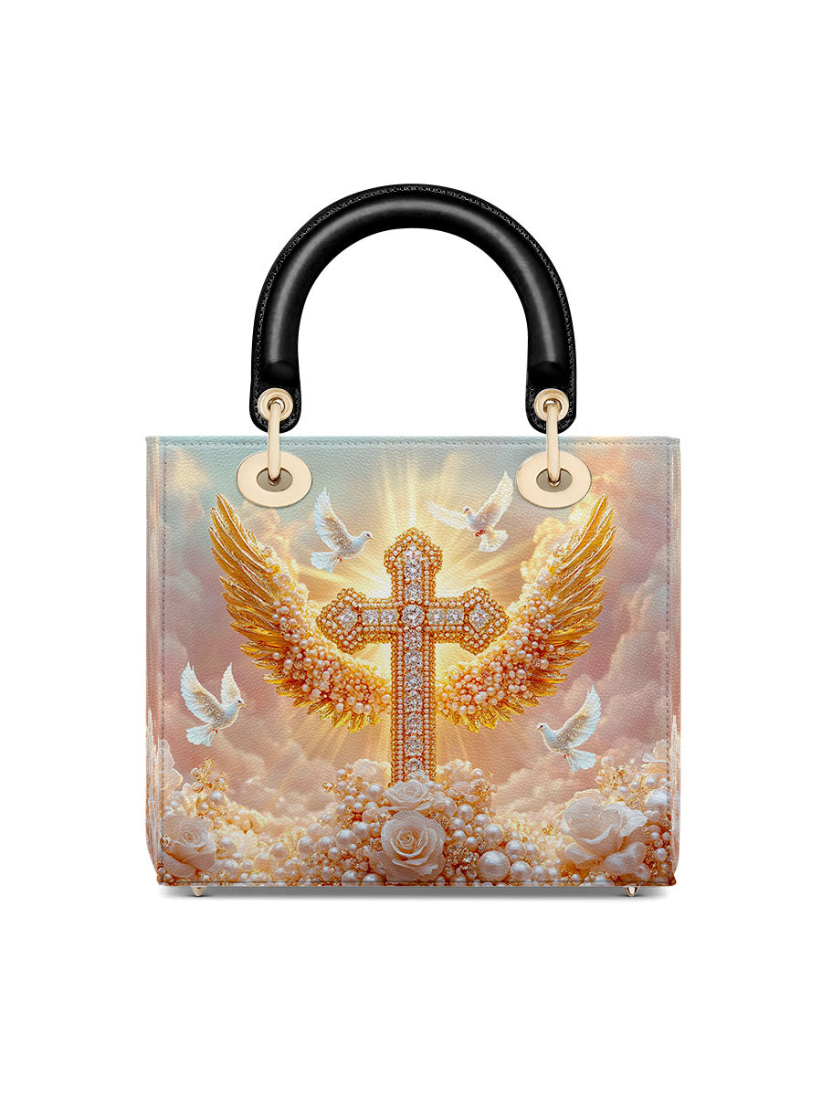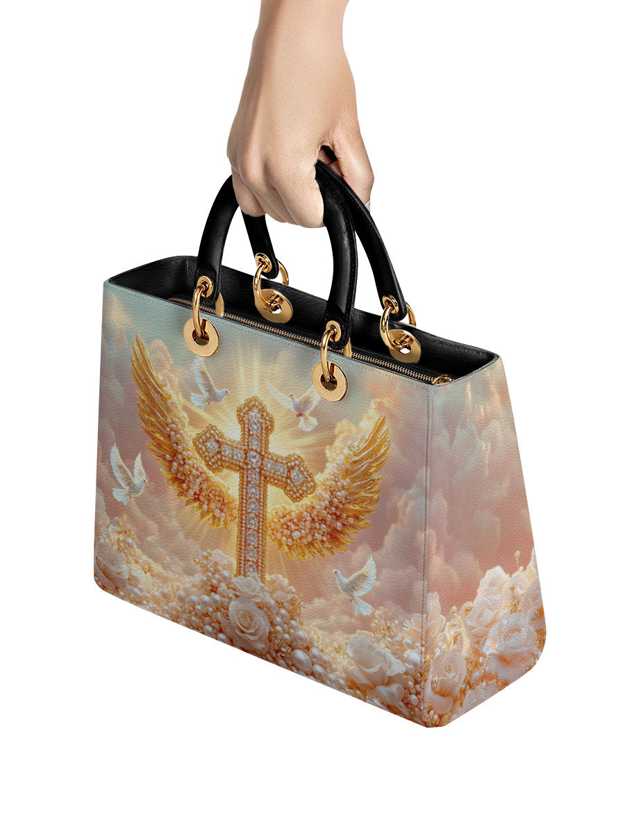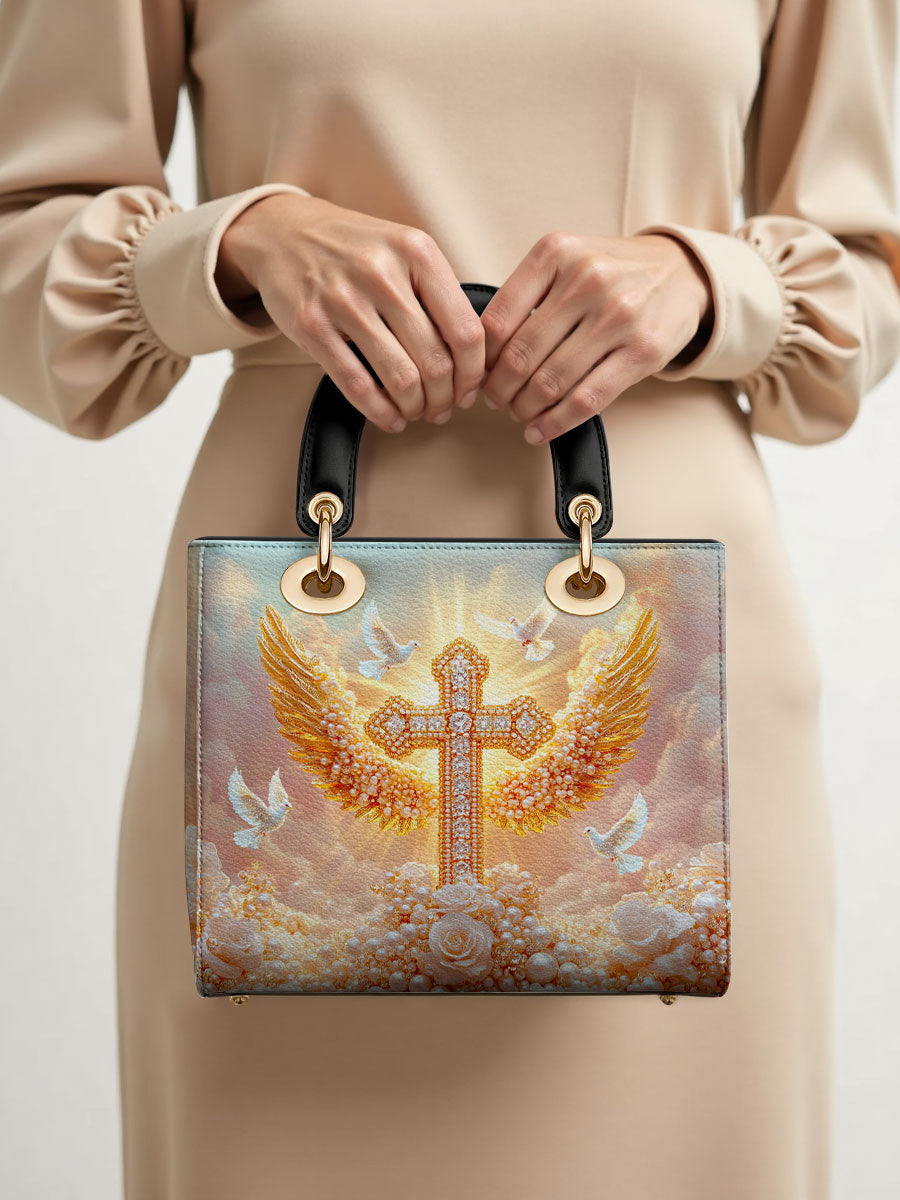 This Lady Leather Bag features a heavenly composition centered on a radiant golden cross adorned with jewels, rising from a bed of white roses and luminous clouds. Framed by golden wings and surrounded by gentle doves in flight, the artwork evokes themes of resurrection, peace, and divine glory. Soft pastel tones of peach, ivory, and light blue add a dreamlike quality that reflects faith and serenity.