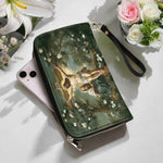 Embrace the profound message of sacrifice and salvation with The Cross of Redemption Leather Wallet Purse. This stunning design showcases a deeply moving depiction of Christ's crucifixion, surrounded by blooming flowers that symbolize hope and renewal. The verdant background evokes a sense of serenity, while the detailed artistry captures the essence of redemption and grace.