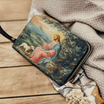 Celebrate the serene guidance and care of the Good Shepherd with The Shepherd's Grace Leather Wallet Purse. This elegant design features a heartwarming image of Christ tending to His lamb, surrounded by a tranquil countryside filled with natural beauty. The delicate details and soothing colors create a sense of peace and divine protection.