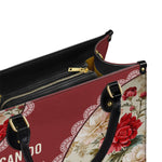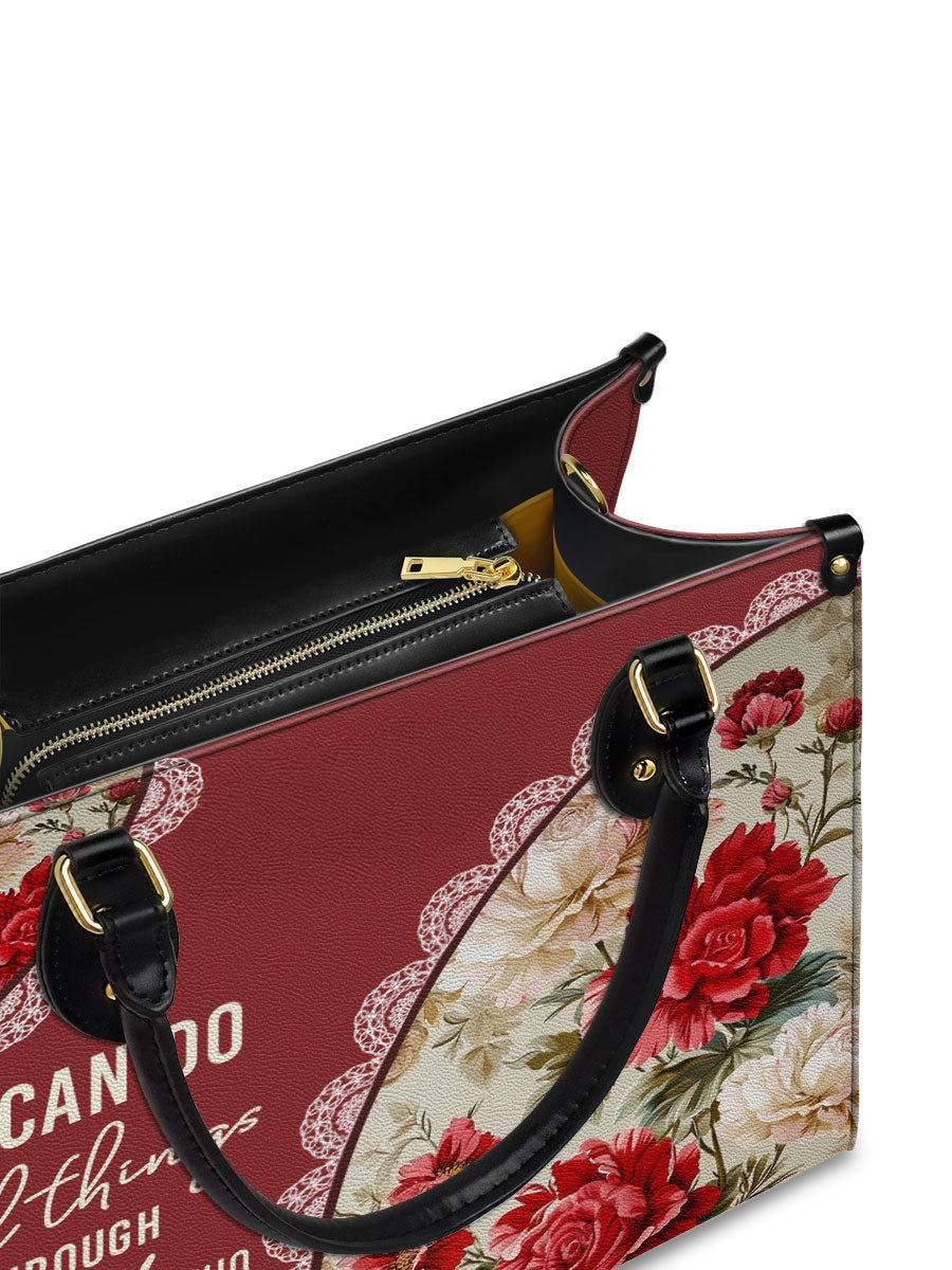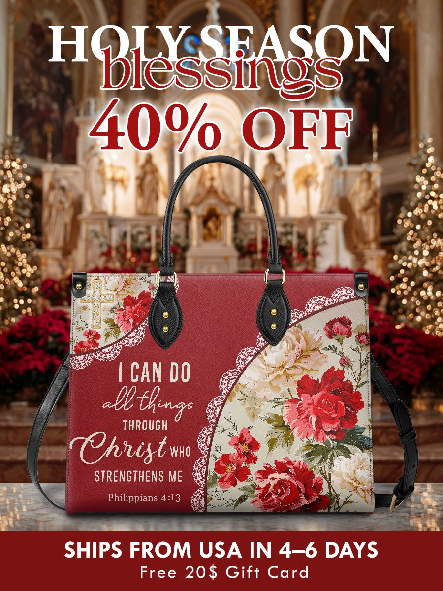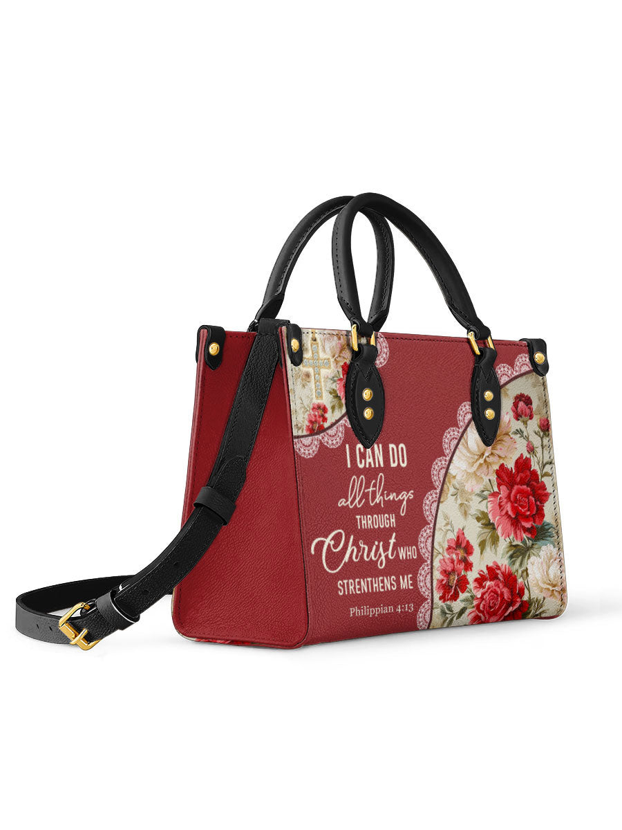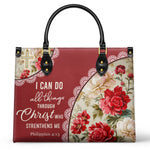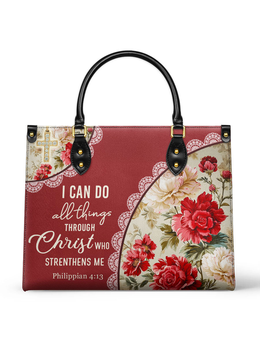 Diese wunderschön gestaltete Ledertasche zeigt den ermutigenden Bibelvers „Ich vermag alles durch den, der mich mächtig macht, Christus“ aus Philipper 4:13. Vor einem satten purpurroten Hintergrund wird der Vers von zarten Spitzenakzenten und lebendigen Blumenmotiven umrahmt, darunter kräftige rote Rosen, die Liebe, Stärke und Glauben symbolisieren. Ein dezentes Kreuz und ein personalisiertes Namensdetail verleihen diesem eleganten und spirituell erhebenden Design eine bedeutungsvolle und persönliche Note.
