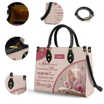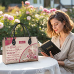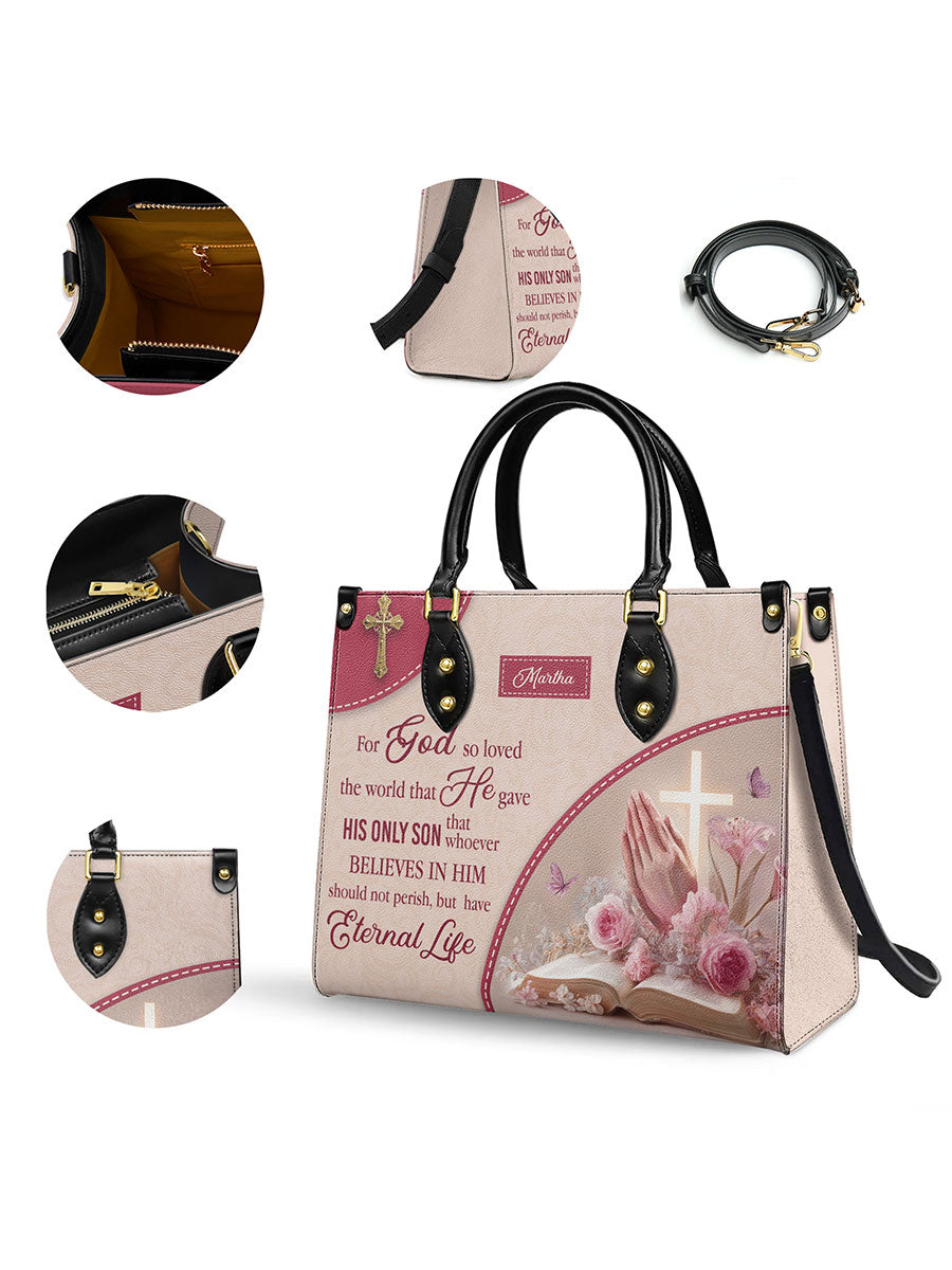 Adorned with praying hands, blooming roses, and the radiant cross, this design speaks to every faithful heart that finds peace in prayer and hope in His Word. Crafted from premium vegan leather with soft tones of blush and gold, it’s elegant, durable, and deeply meaningful — perfect for church, daily use, or as a heartfelt gift of faith.