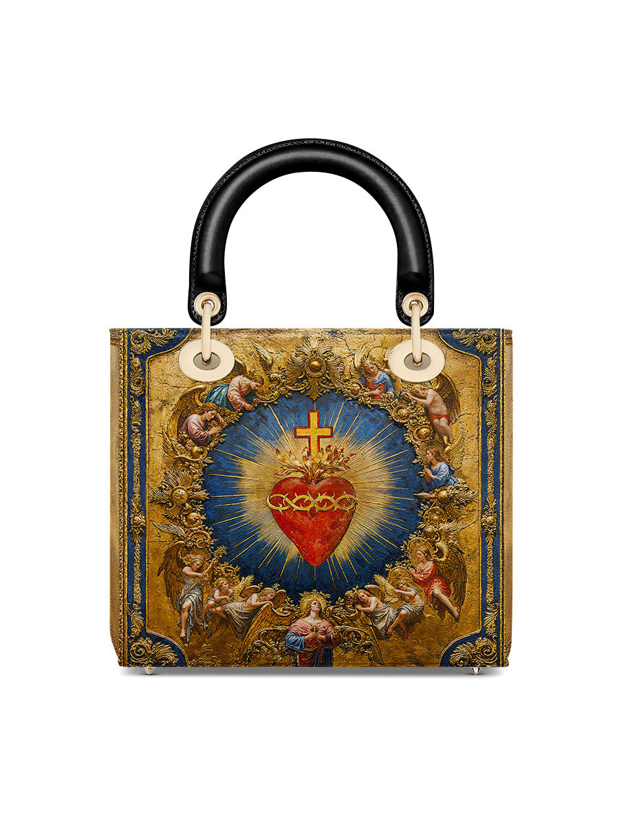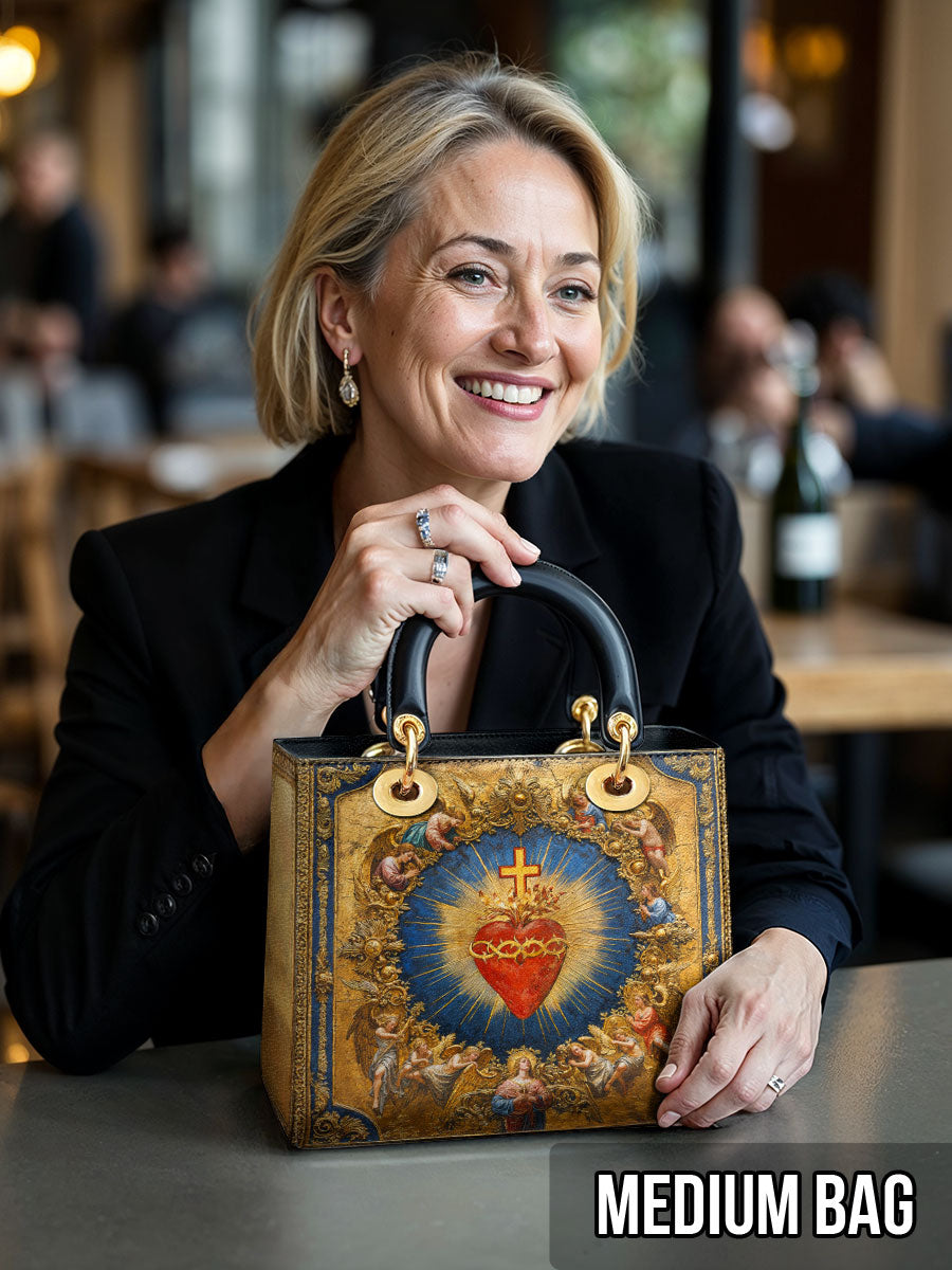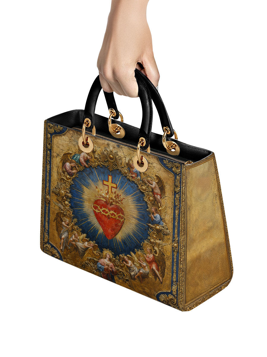 This Lady Leather Bag features a majestic rendering of the Sacred Heart of Jesus, glowing at the center of an ornate golden frame surrounded by adoring angels. The deep blue and gold background enhances the divine radiance, while intricate detailing and vibrant color evoke the solemn beauty of classical religious art. The heart, crowned with thorns and a cross, symbolizes Christ’s boundless love and sacrifice.