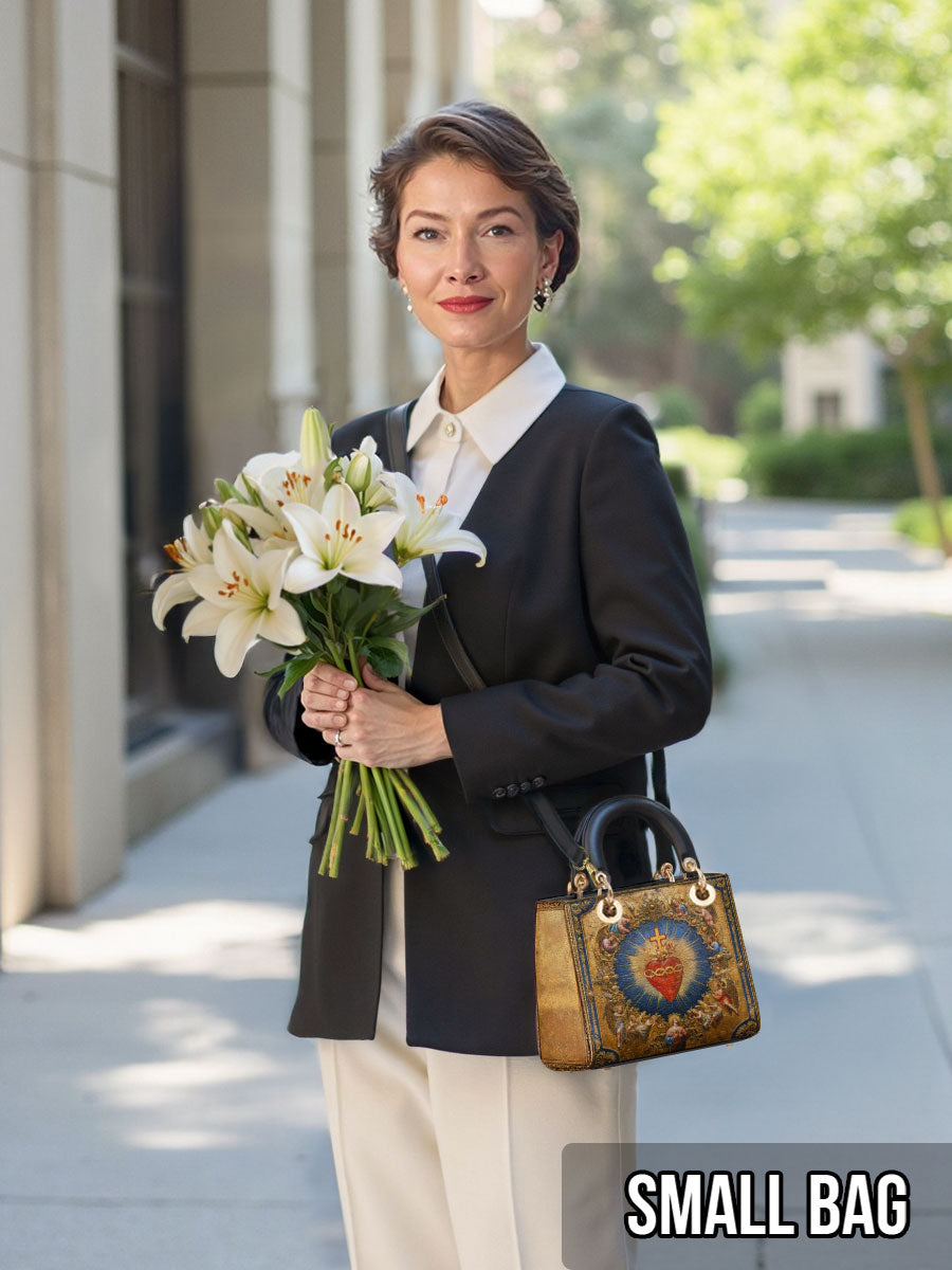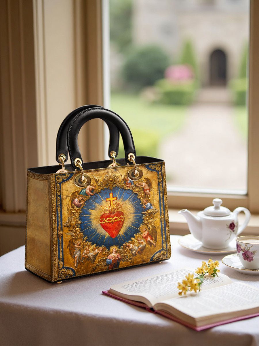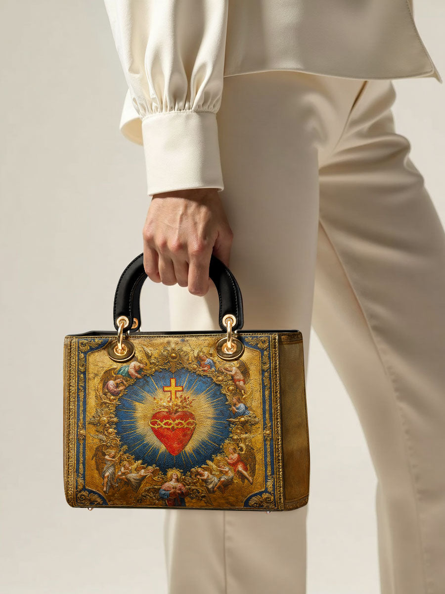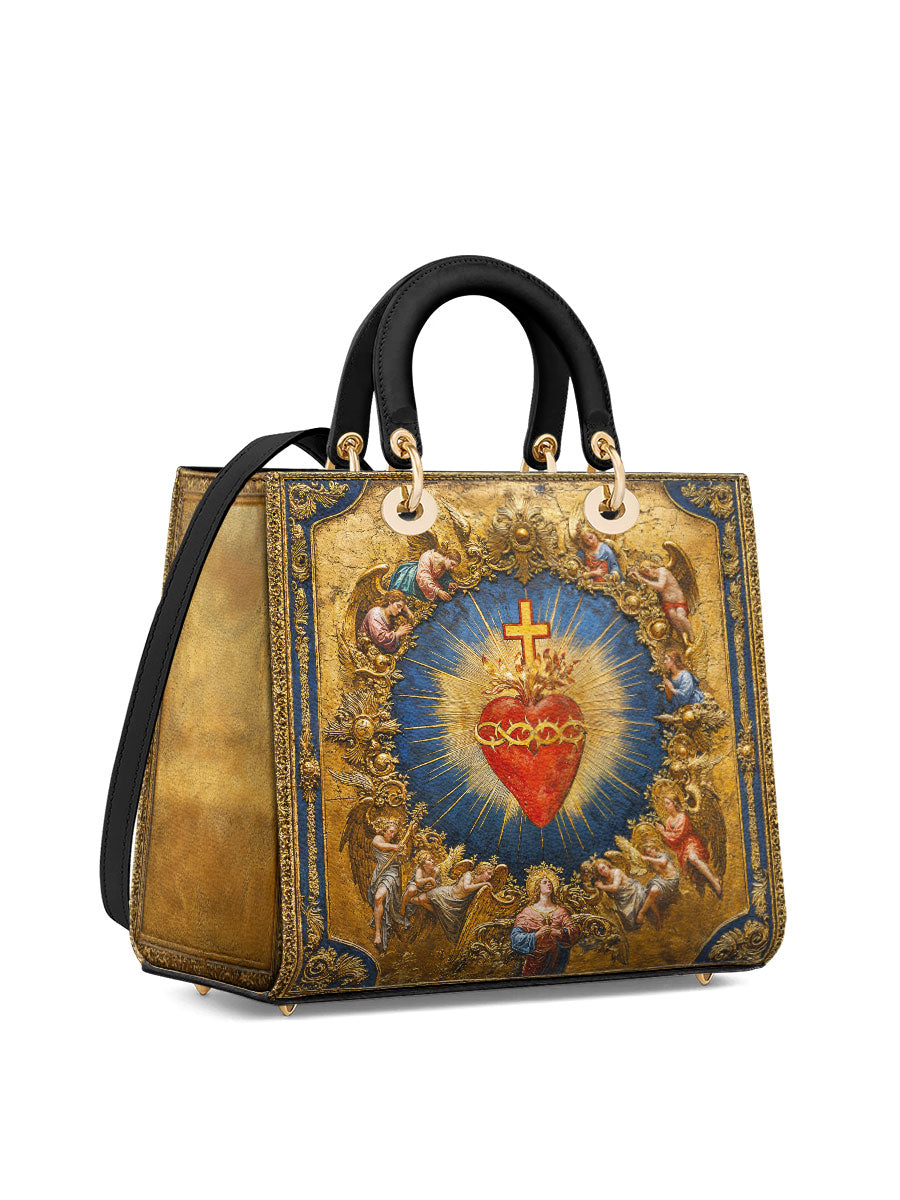 This Lady Leather Bag features a majestic rendering of the Sacred Heart of Jesus, glowing at the center of an ornate golden frame surrounded by adoring angels. The deep blue and gold background enhances the divine radiance, while intricate detailing and vibrant color evoke the solemn beauty of classical religious art. The heart, crowned with thorns and a cross, symbolizes Christ’s boundless love and sacrifice.