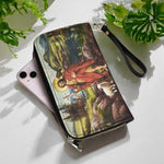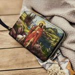 Diese atemberaubende Brieftasche zeigt eine lebendige Darstellung des Heiligen Johannes des Täufers inmitten einer ruhigen ländlichen Umgebung, die Glauben, Demut und spirituelle Stärke verkörpert. Im Mittelpunkt des Designs ist der Heilige Johannes zu sehen, der einen Stab mit einem Kreuz hält, das seine Rolle als Vorläufer Christi symbolisiert, und ein Lamm, das Jesus als Lamm Gottes darstellt. Sein rotes Gewand symbolisiert sein Martyrium und seine unerschütterliche Hingabe an seine göttliche Mission.