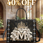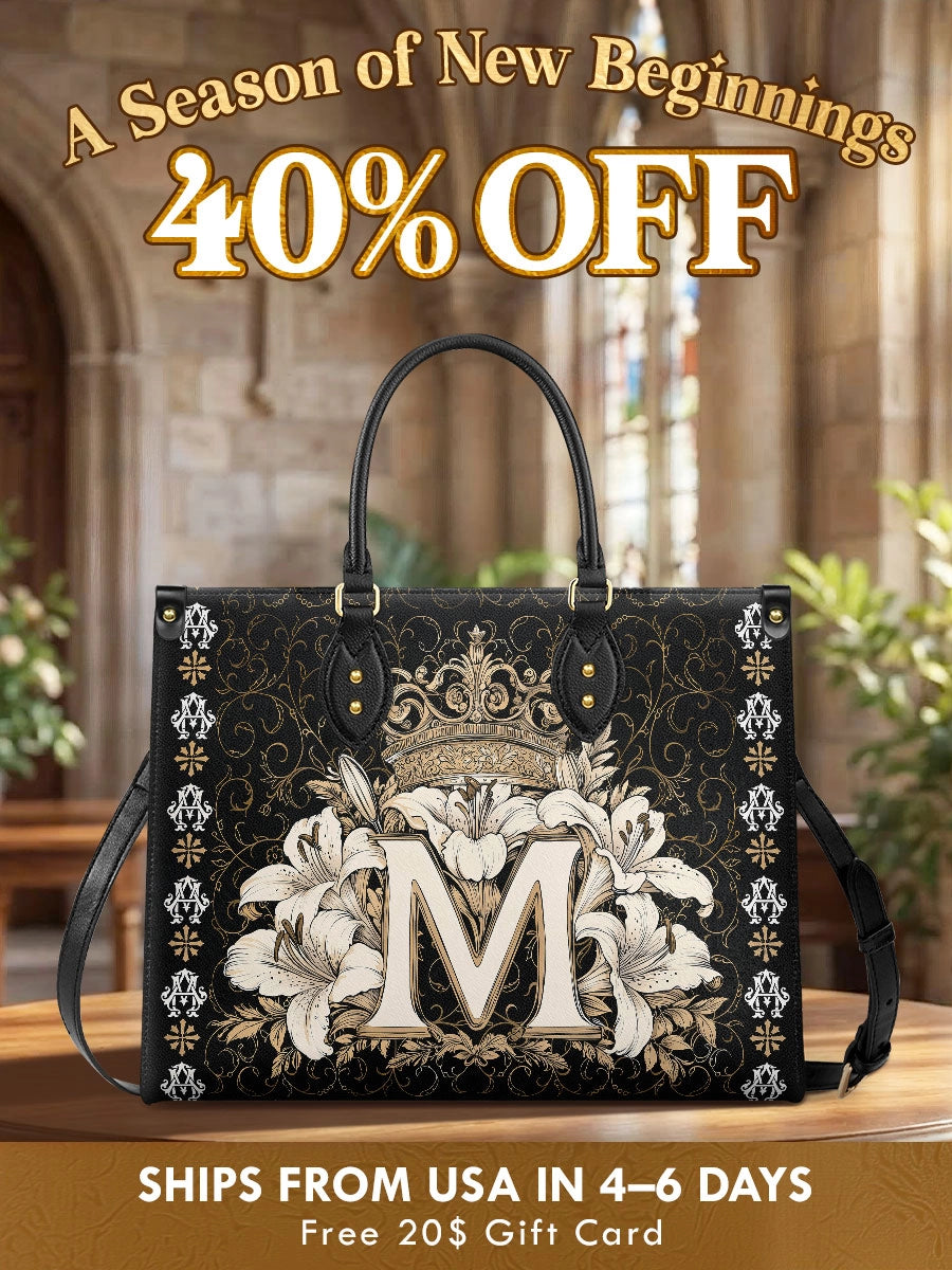 The "Divine Monogram Leather Bag" is a striking tribute to the Blessed Virgin Mary, featuring a majestic "M" monogram encircled by radiant white lilies and crowned with an ornate golden crown. The rich black background and intricate decorative patterns emphasize the regal beauty and sacred symbolism of the design, representing Mary's purity, grace, and her role as the Queen of Heaven.