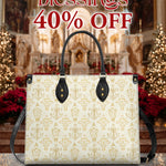The leather bag is a stunning celebration of faith and devotion, featuring an intricate repeating design of the Blessed Virgin Mary intertwined with elegant floral and ornamental details. The soft, golden accents on the neutral background create a timeless and sophisticated look, symbolizing purity, grace, and divine serenity.