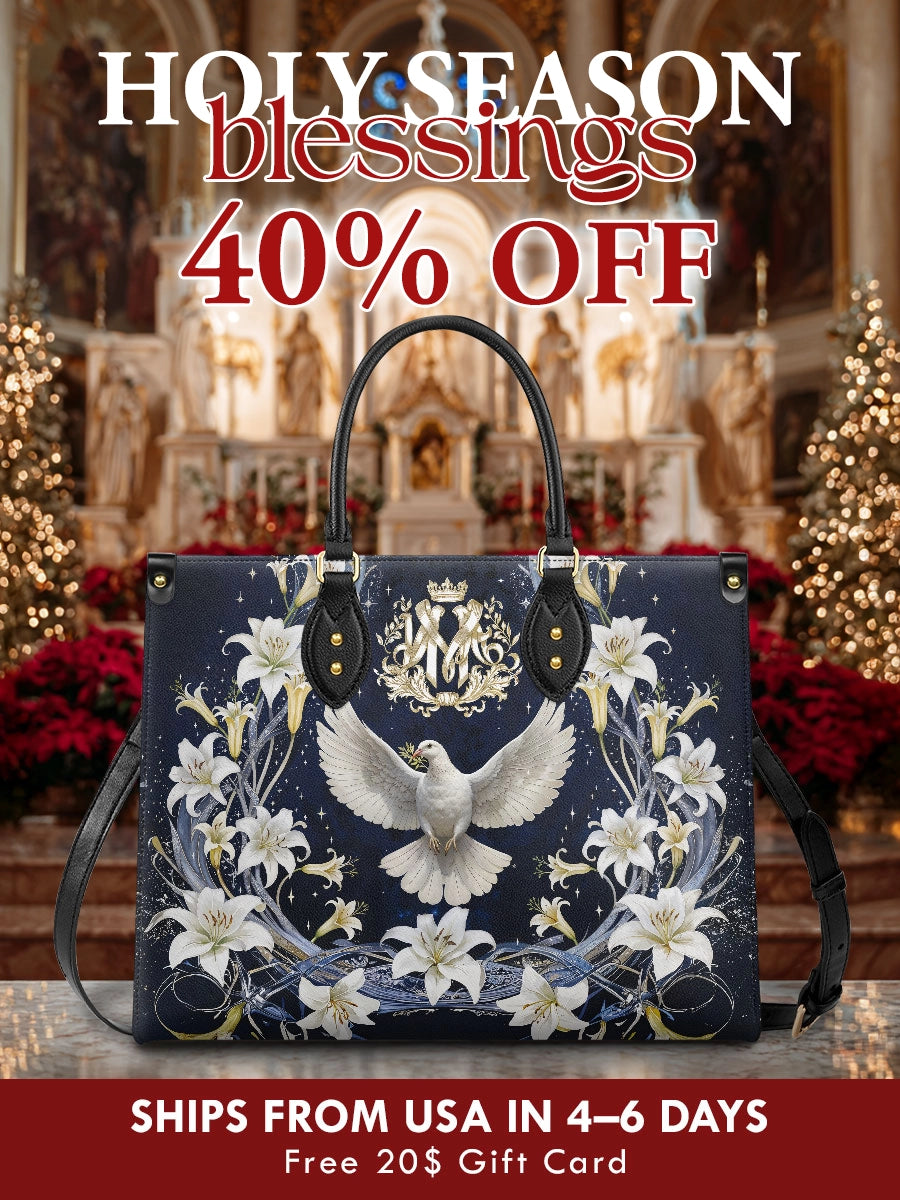 This beautifully designed leather bag embodies spiritual devotion, featuring a radiant depiction of the Holy Spirit represented by the pure white dove at its center. The dove, with outstretched wings, symbolizes peace, divine guidance, and the presence of the Holy Spirit in our lives.