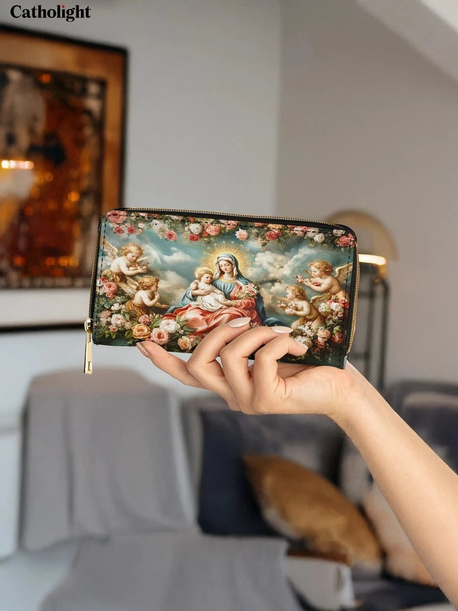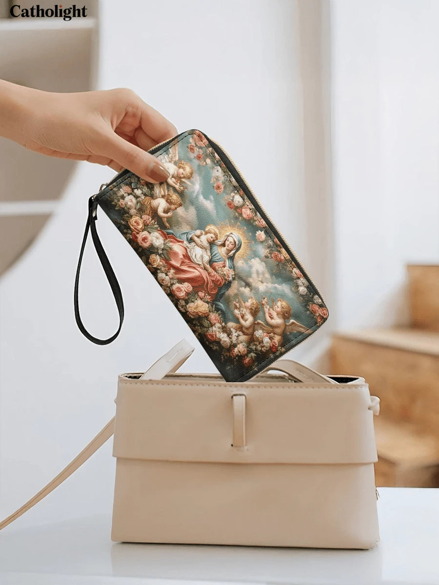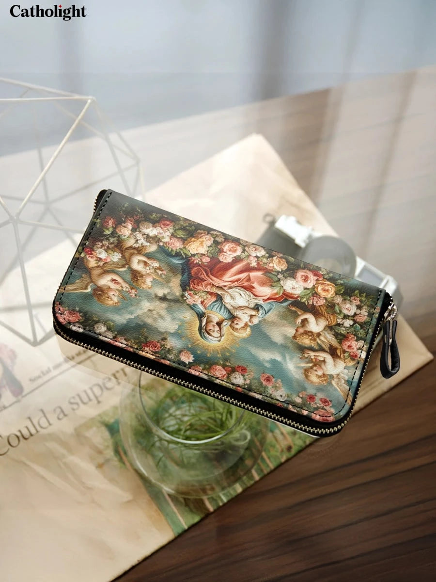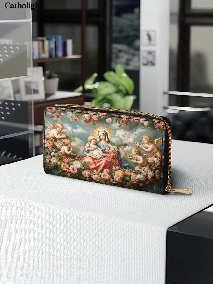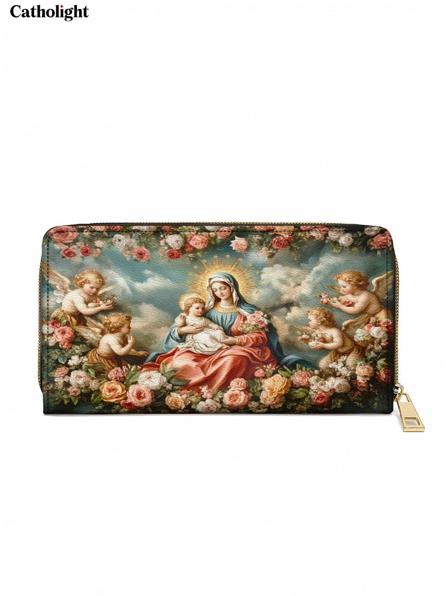 This exquisite wallet showcases a radiant depiction of the Virgin Mary and the Child Jesus surrounded by cherubic angels and a lush arrangement of blooming roses. The heavenly scene is set against a serene blue sky, with golden halos illuminating the figures, symbolizing divine love and grace. The vibrant roses add a touch of beauty and devotion, emphasizing purity and the Queen of Heaven’s tender care.