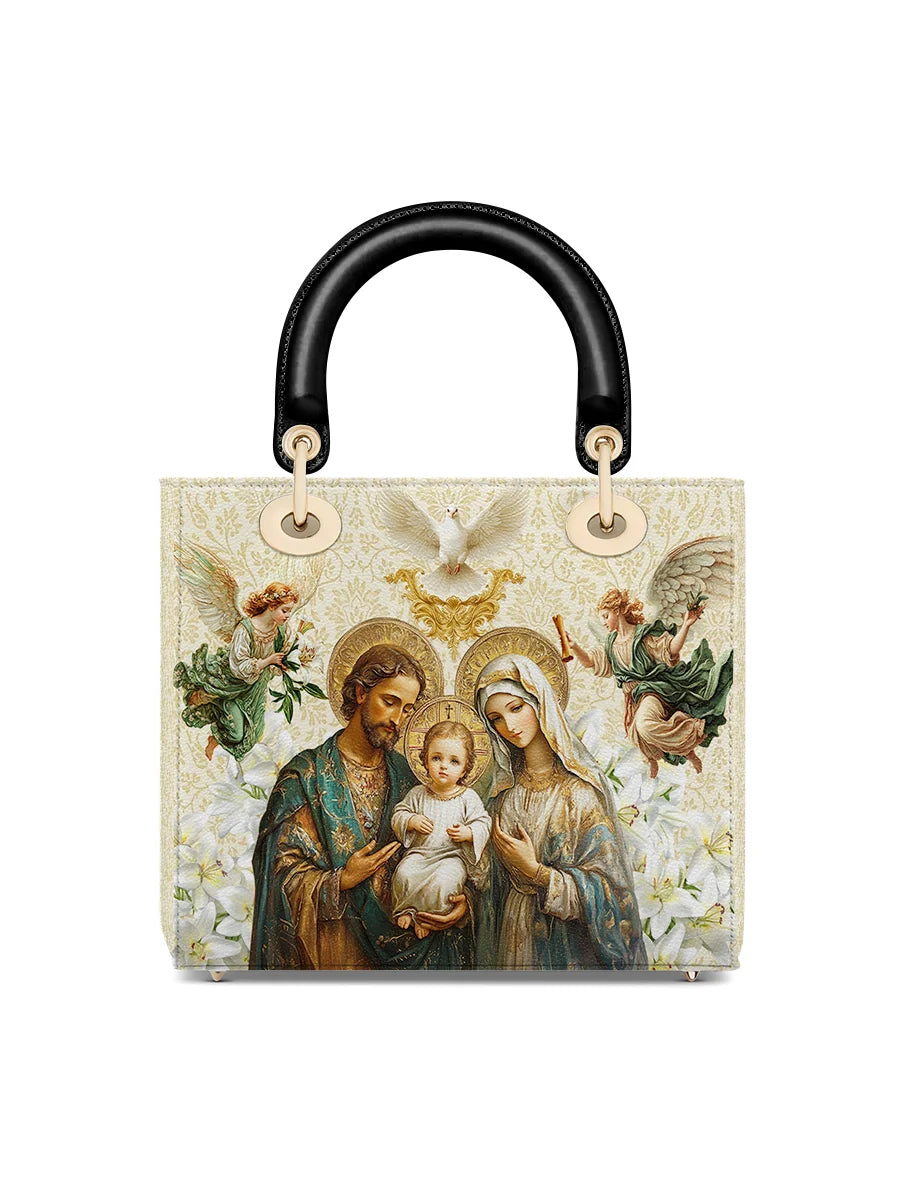 Carrying this bag brings a sense of spiritual connection and grace, a daily expression of faith and devotion. The intricate details of the art, from the heavenly doves to the tender embrace of the family, create a visual masterpiece that resonates deeply with the heart.