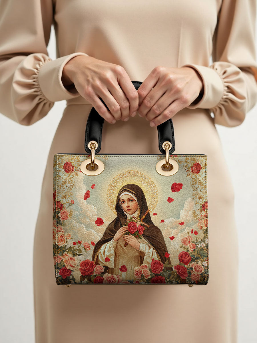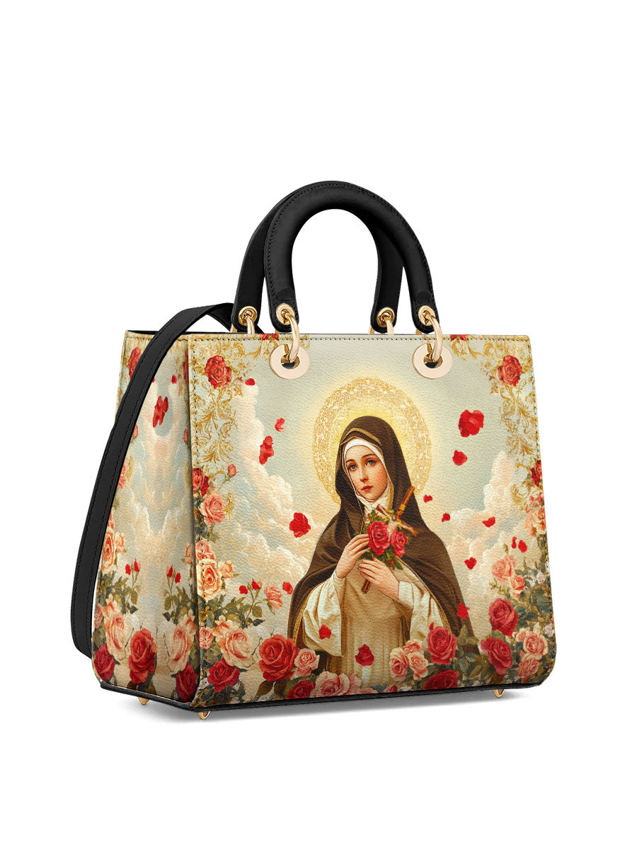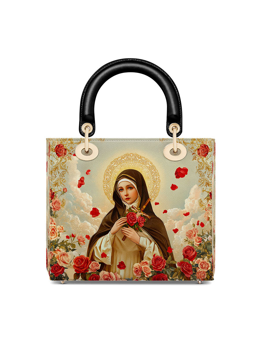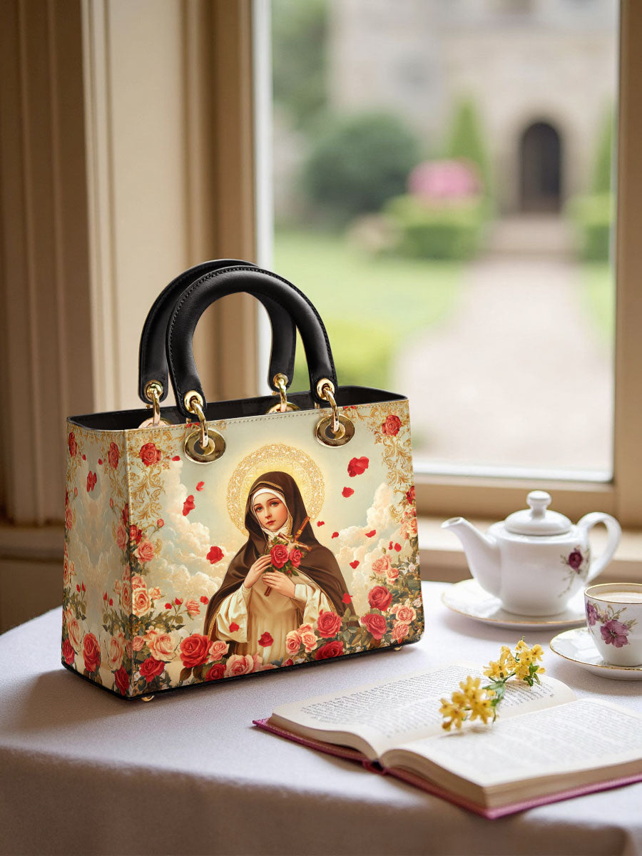 This graceful leather bag features a tender portrait of Saint Thérèse of Lisieux, surrounded by soft clouds, golden light, and a cascade of red roses—symbols of her love, humility, and promise to “let fall a shower of roses” from heaven. Her gentle gaze and the bloom in her hand evoke quiet faith and spiritual beauty, offering comfort to those who seek strength through devotion.