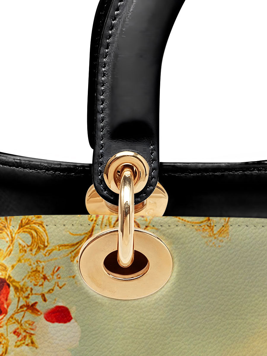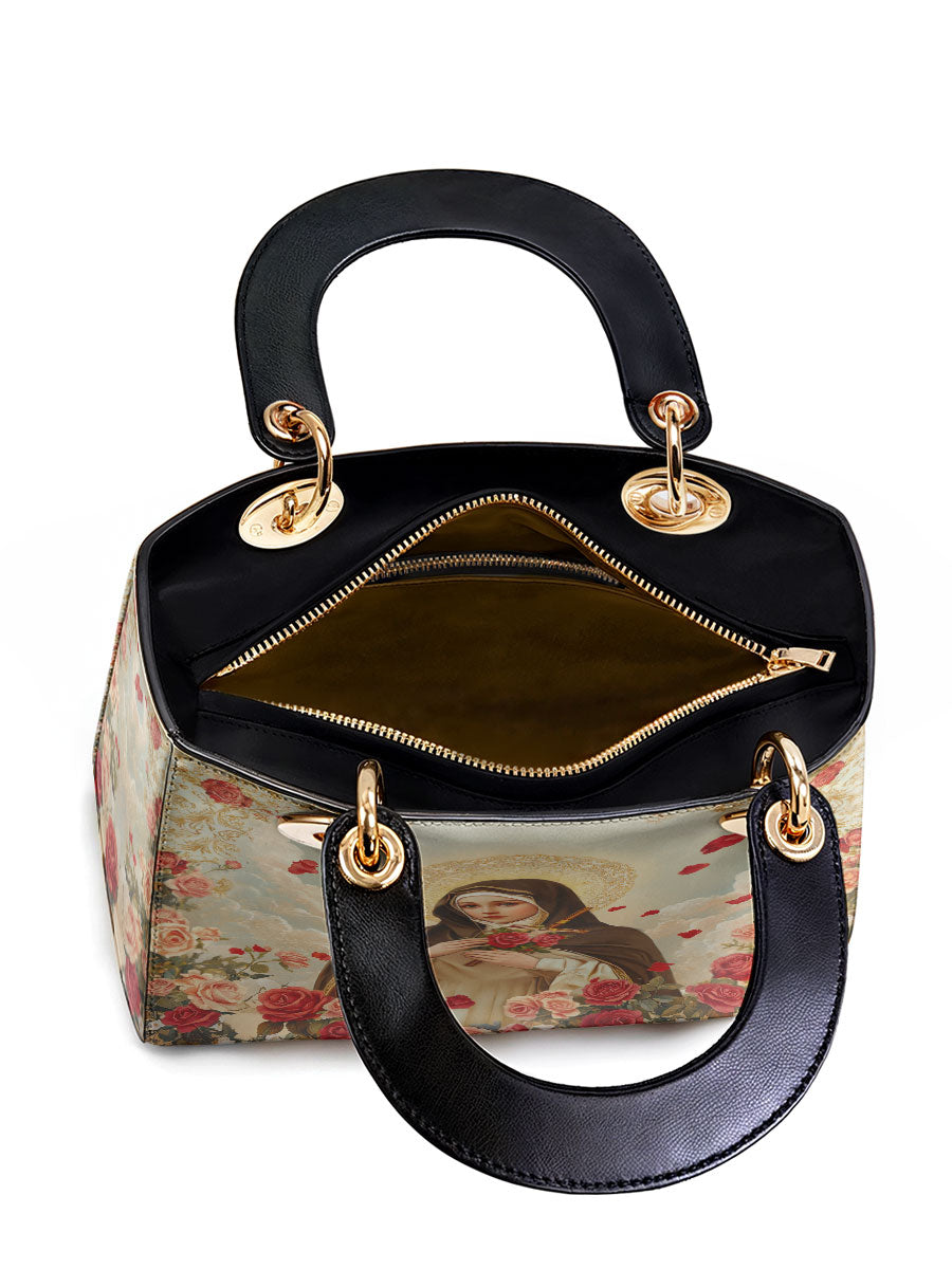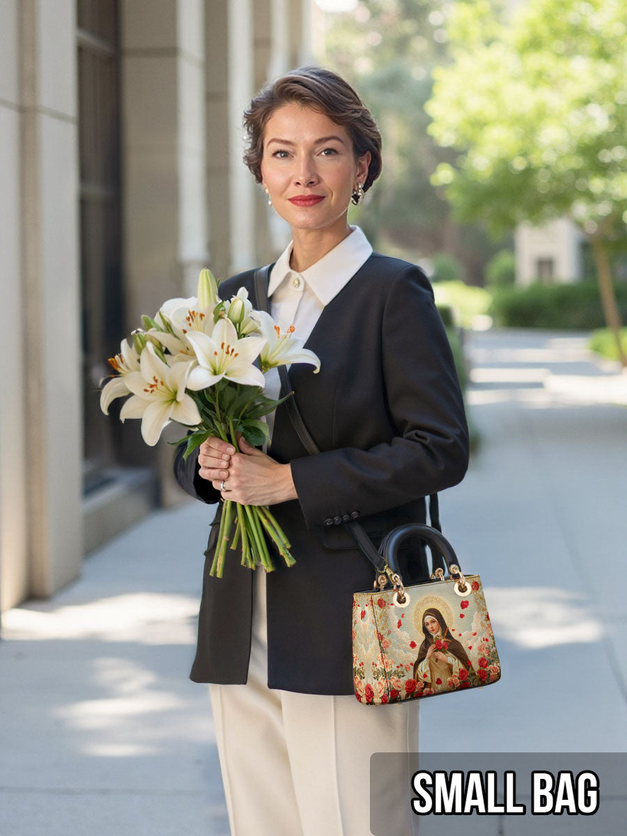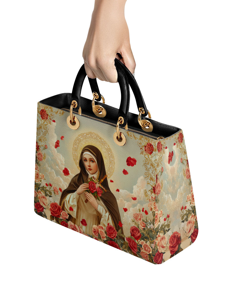 This graceful leather bag features a tender portrait of Saint Thérèse of Lisieux, surrounded by soft clouds, golden light, and a cascade of red roses—symbols of her love, humility, and promise to “let fall a shower of roses” from heaven. Her gentle gaze and the bloom in her hand evoke quiet faith and spiritual beauty, offering comfort to those who seek strength through devotion.