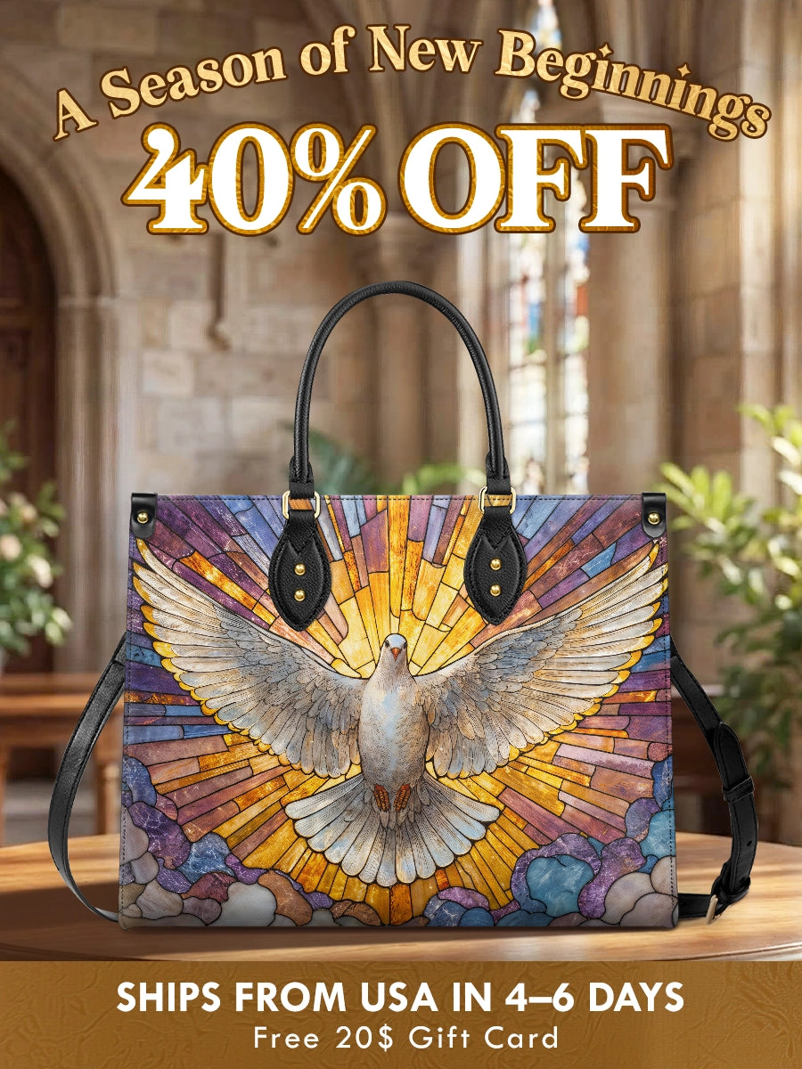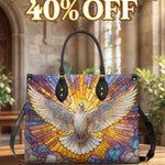 The Holy Dove Radiance Leather Bag depicts the Holy Spirit as a radiant dove, wings outstretched against golden beams and stained glass brilliance. A timeless Christian symbol of peace, purity, and divine presence, the design inspires faith and serenity in every step.