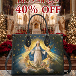 This exquisite leather bag captures the divine grace and celestial beauty of the Immaculate Mary, Queen of Heaven. Centered in the artwork, Mary is portrayed in her iconic serene pose, adorned in a flowing white gown and a radiant blue mantle, symbolizing her purity and heavenly grace. Encircled by cherubic angels casting golden rays of light, she is exalted in glory, standing upon a crescent moon—a testament to her role as the woman of Revelation.