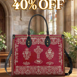 This luxurious leather bag features a deep crimson background adorned with intricate golden designs centered on a beautifully detailed cross. The cross, symbolizing faith, redemption, and divine grace, is surrounded by sacred Christian motifs and delicate floral accents, creating a timeless and meaningful representation of devotion. The rich combination of colors and patterns evokes reverence and the enduring beauty of faith.