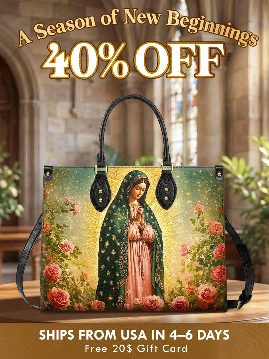 This stunning leather bag features a radiant depiction of Our Lady of Guadalupe, surrounded by a halo of golden light that symbolizes her divine grace and compassion. Dressed in her iconic emerald green mantle adorned with delicate stars, and a soft rose-colored gown, the Blessed Virgin stands in a serene posture of prayer, exuding peace and maternal love. Vibrant pink roses bloom around her, reflecting the miraculous roses of her apparition to Saint Juan Diego, symbolizing faith, hope, and the beauty of God’s miracles.