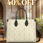 The leather bag is a stunning celebration of faith and devotion, featuring an intricate repeating design of the Blessed Virgin Mary intertwined with elegant floral and ornamental details. The soft, golden accents on the neutral background create a timeless and sophisticated look, symbolizing purity, grace, and divine serenity.