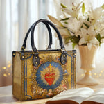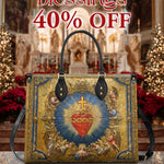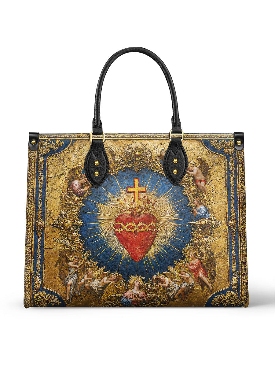 This breathtaking leather bag is a radiant tribute to the Sacred Heart of Jesus, an eternal symbol of divine love, compassion, and redemption. At its center, the Sacred Heart glows with vibrant red hues, crowned with thorns and illuminated by golden rays, signifying Christ’s sacrifice and unwavering love for humanity. The cross above the heart symbolizes faith and salvation, casting light upon all who carry its message.