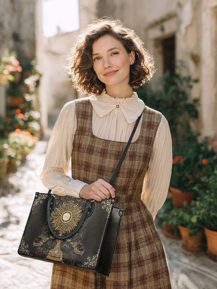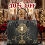 This sophisticated leather bag showcases a magnificent depiction of the sacred monstrance, adorned with radiant golden rays and intricate detailing that honors the divine presence in the Eucharist. Surrounded by delicate floral designs and angelic motifs, the artwork beautifully embodies the reverence and splendor of the Corpus Christi tradition. The deep black background enhances the brilliance of the gold accents, creating a striking and spiritual design.