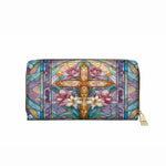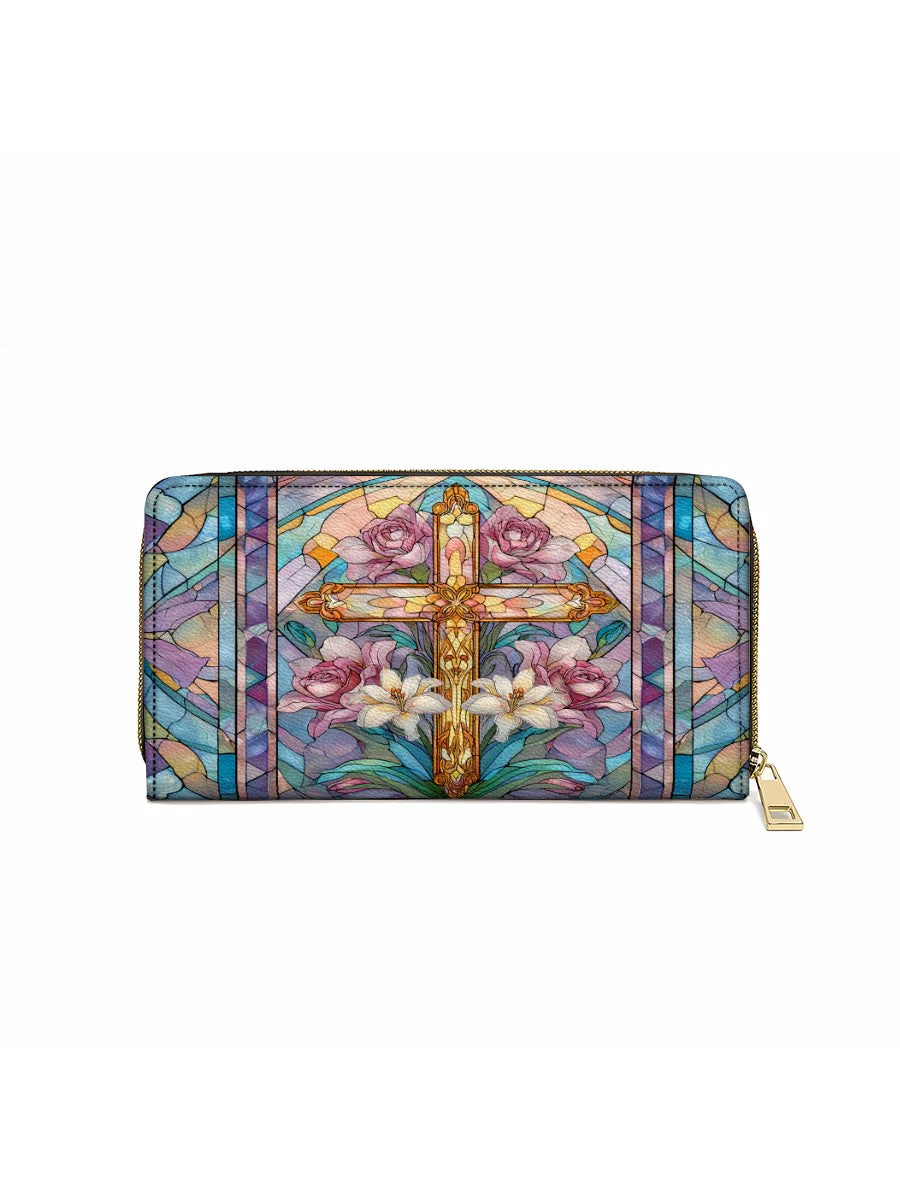 Elegant and symbolic, the Floral Cross Radiance Wallet beautifully depicts a golden cross surrounded by blooming lilies and roses, framed in delicate stained-glass patterns of soft pastels. The design reflects both faith and renewal — the lilies symbolizing purity and resurrection, while the roses embody love and devotion.