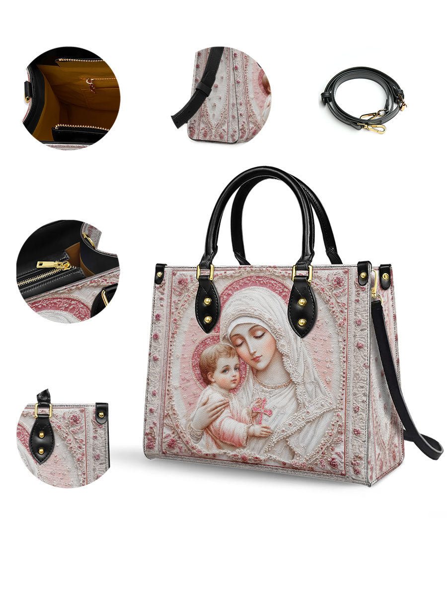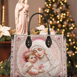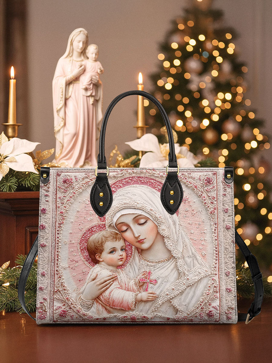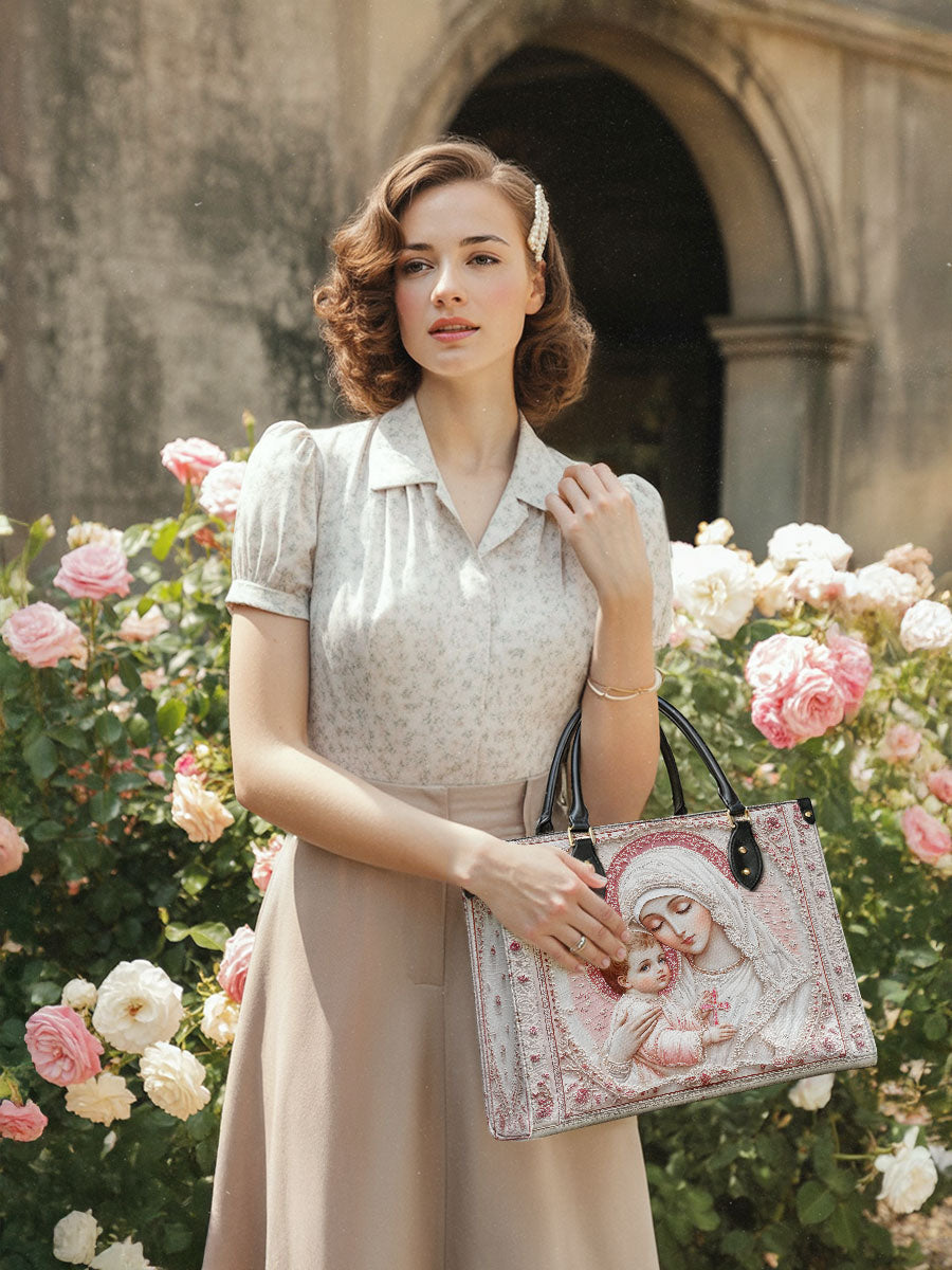 Sacred Serenity: The Madonna’s Tender Embrace Leather Bag is a masterpiece of faith and elegance, featuring an exquisite depiction of the Virgin Mary cradling Baby Jesus in a moment of divine love and devotion. Wrapped in soft hues of ivory and blush pink, this design radiates serenity, warmth, and grace. Intricate details and ornate textures enhance the ethereal beauty, making this bag a perfect blend of spirituality and timeless luxury.