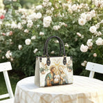 Ce sac en cuir exquis présente une belle représentation de la Sainte Famille—Jésus, Marie et Joseph—entourés d'anges et de délicates lys. Le riche symbolisme et les couleurs apaisantes évoquent un sentiment d'amour divin, de protection et d'unité. L'atmosphère radieuse et éthérée de l'œuvre invite à des sentiments de sérénité et d'espoir, en faisant un parfait rappel du lien sacré de la Sainte Famille.