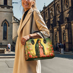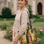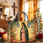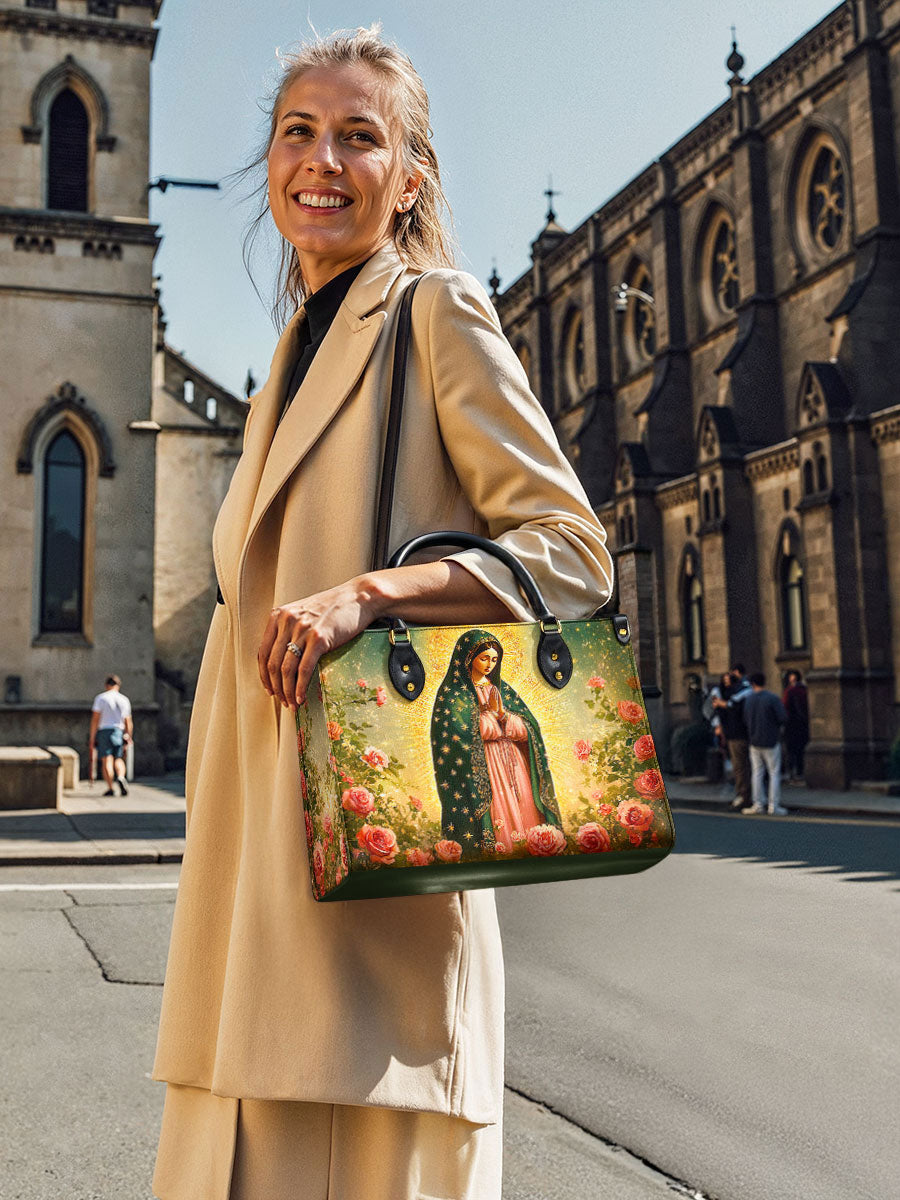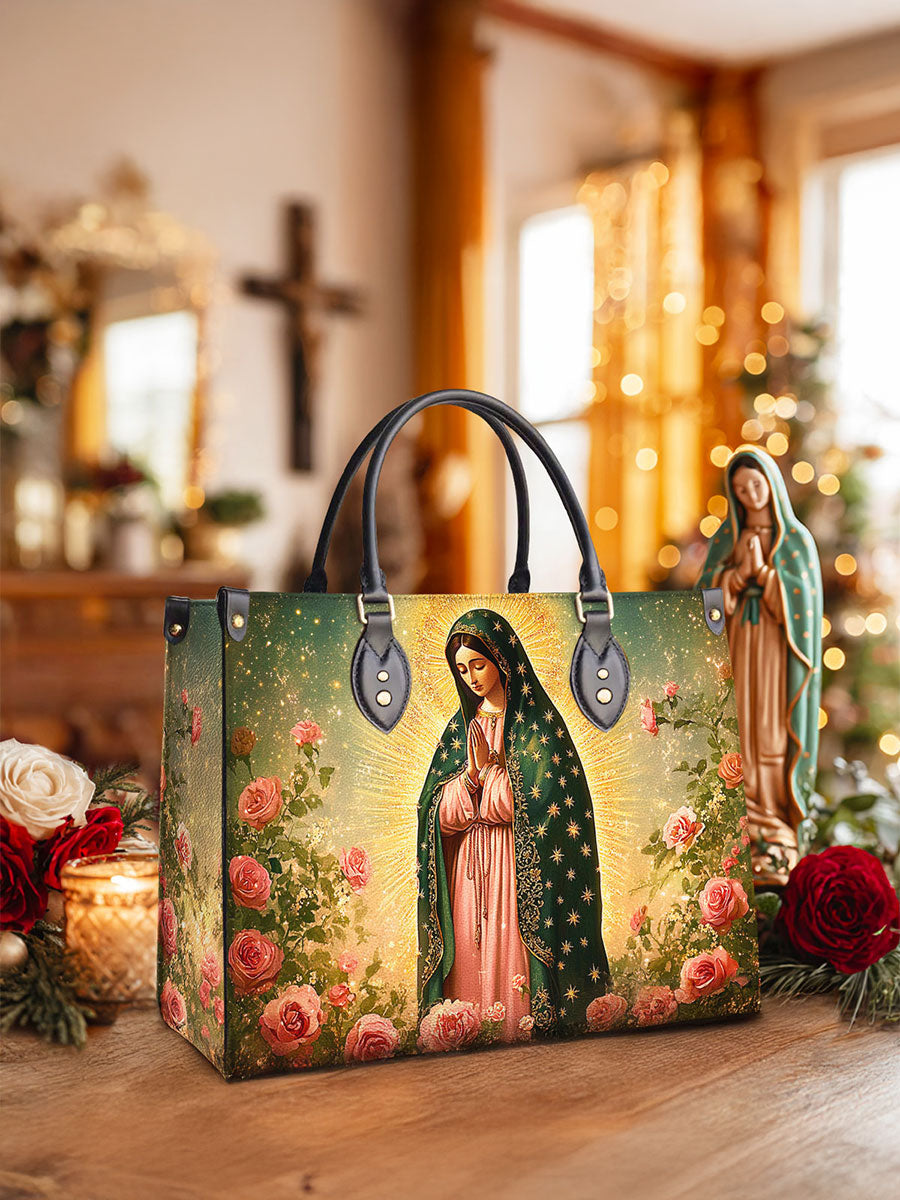 Ce magnifique sac en cuir présente une représentation radieuse de Notre-Dame de Guadalupe, entourée d'un halo de lumière dorée qui symbolise sa grâce divine et sa compassion. Vêtue de son manteau vert émeraude emblématique orné de délicates étoiles, et d'une douce robe rose, la Sainte Vierge se tient dans une posture sereine de prière, dégageant paix et amour maternel. De vibrantes roses roses fleurissent autour d'elle, reflétant les roses miraculeuses de son apparition à Saint Juan Diego, symbolisant la foi, l'espoir et la beauté des miracles de Dieu.