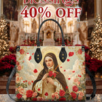 Questa squisita borsa in pelle onora Santa Teresa di Lisieux, affettuosamente conosciuta come "La Piccola Fiore." L'opera d'arte presenta Santa Teresa che tiene una delicata rosa, simbolo della sua promessa di inviare “una pioggia di rose” come benedizioni dal cielo. Circondata da rose in fiore e dolci nuvole, la sua espressione serena riflette la sua profonda devozione, umiltà e fede incrollabile. L'aureola dorata accentua la sua santità, creando un'immagine radiosa e spiritualmente elevante. Questa borsa in pelle è un bellissimo tributo al suo messaggio d'amore e fiducia in Dio.