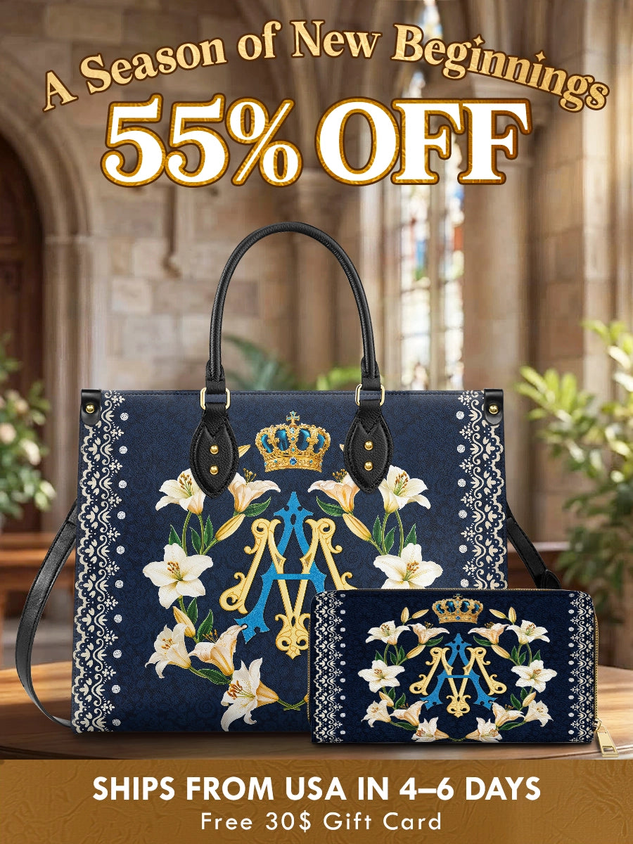 The structured handbag pairs elegance with function, while the matching wallet keeps your essentials close — both honoring the beauty of faith in every detail.