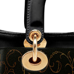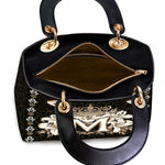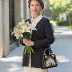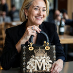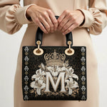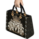 The "Divine Monogram Leather Bag" is a striking tribute to the Blessed Virgin Mary, featuring a majestic "M" monogram encircled by radiant white lilies and crowned with an ornate golden crown. The rich black background and intricate decorative patterns emphasize the regal beauty and sacred symbolism of the design, representing Mary's purity, grace, and her role as the Queen of Heaven.