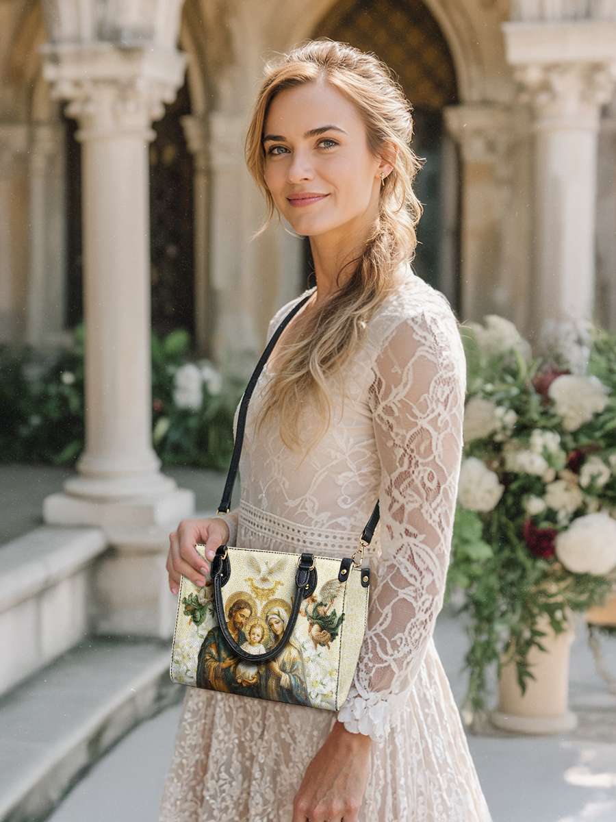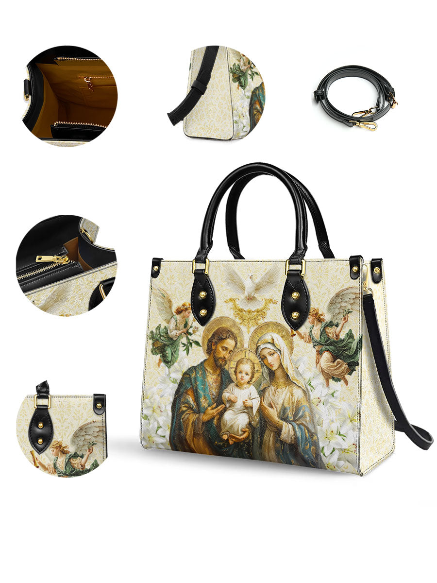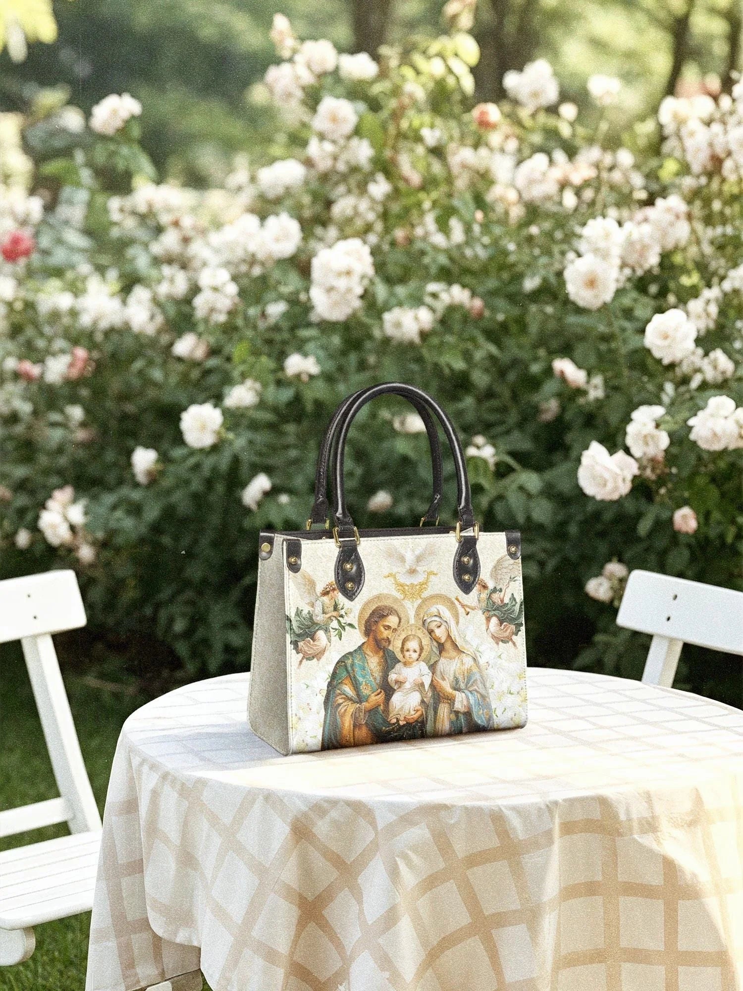この精巧なレザーバッグは、天使と繊細なユリに囲まれた聖家族—イエス、マリア、ヨセフ—の美しい描写を特徴としています。豊かな象徴性と穏やかな色合いは、神の愛、保護、そして団結の感覚を呼び起こします。作品の輝かしく、空気のような雰囲気は、静けさと希望の感情を招き、聖家族の神聖な絆を思い出させる完璧なアイテムとなっています。
