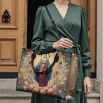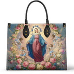 Framed by blooming peonies and soft golden skies, the artwork evokes both reverence and beauty, making it more than just a handbag—it’s a declaration of faith. Whether carried to church, prayer group, or everyday errands, this piece invites you to walk with Mary and carry her presence wherever you go.