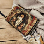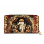 Surrounded by an intricate floral border in rich red and gold tones, the artwork evokes a sense of majesty and grace, making this wallet a timeless piece that celebrates the essence of faith and rebirth.