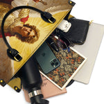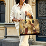 This majestic leather bag features a powerful depiction of Saint Michael the Archangel, the defender of Heaven and protector of God’s people. Dressed in radiant golden armor and a flowing red cape, Saint Michael stands with unwavering strength and divine authority. He holds a shining sword in one hand, symbolizing his role as the vanquisher of evil, and a balanced scale in the other, representing justice and righteousness. The soft glow of light behind his majestic wings and the blooming roses at his feet add a touch of grace and beauty to the commanding scene.