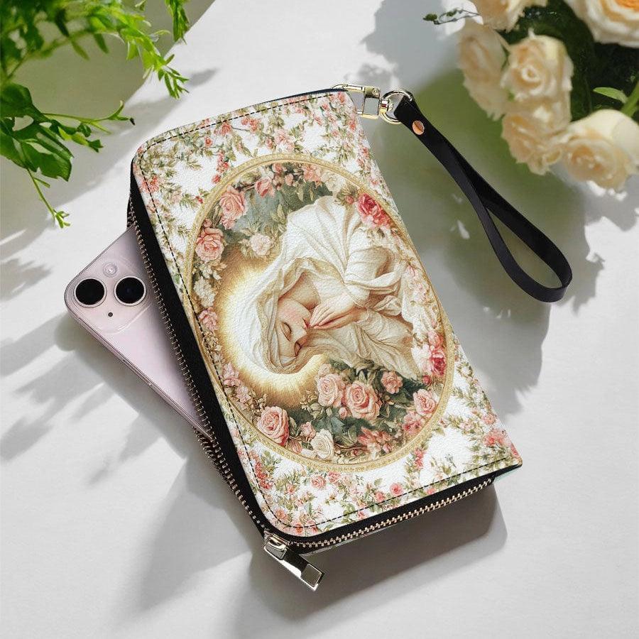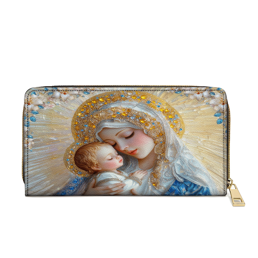 Catholight Sacred Serenity: The Madonna’s Tender Embrace - Leather Wallet Purse